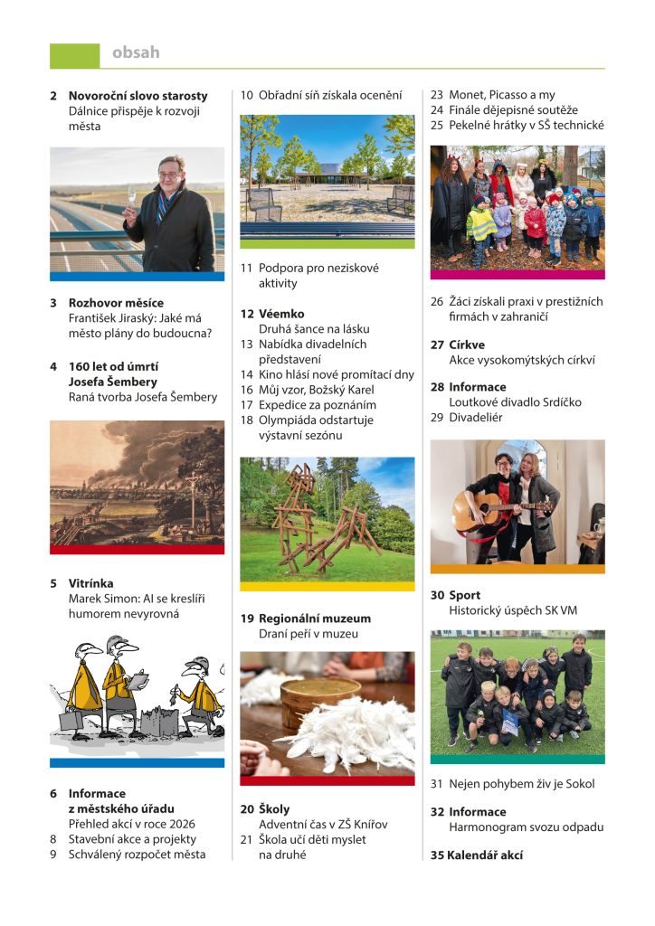 První číslo Vysokomýtského zpravodaje v roce 2026 otevírá tradiční novoroční slovo starosty města Františka Jiraského, který se v něm ohlíží za uplynulým rokem a vyzdvihuje zejména historický milník v podobě otevření dálnice D35 kolem našeho města. Na toto téma navazuje i rozhovor měsíce, v němž starosta přibližuje další plány a výzvy, které Vysoké Mýto v budoucnu čekají. Nová rubrika regionálního muzea  připomíná 160 let od úmrtí významného rodáka a kreslíře Josefa Šembery. Pravidelná rubrika Vitrínka v tomto čísle představuje dalšího držitele sošky Kujeby, karikaturistu Marka Simona. Ani tentokrát nechybí informace z radnice, pozvánky na akce společnosti. Pro občany je dále připraven důležitý servis v podobě aktuálního harmonogramu svozu. Zpravodaj uzavírá bohatý kalendář akcí s pozvánkami na novoroční ohňostroj, plesy a další společenské události.