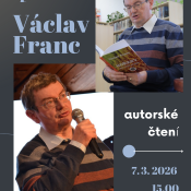 Přijměte pozvání na setkání se spisovatelem Václavem Francem (*1961), prozaikem a básníkem, který vás provede svou literární tvorbou jako rozkvetlou zahradou. Václav Franc vystudoval stomatologii na UK a působil jako zubní lékař. Je zakladatelem literární soutěže humoru Řehečská slepice a redaktorem časopisů KOBRA a ČAJ. Vstupné dobrovolné.