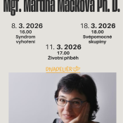 Přednáška Martiny Mackové. Nechcete už zůstávat se svými starostmi sami? Svépomocné skupiny nabízejí prostor pro sdílení zkušeností a vzájemnou podporu. V březnu otevíráme skupiny pro pečující, osamocené seniory, rodiče samoživitele, rodiče v rozvodu a skupinu prevence syndromu vyhoření. Kontakt – tel.: 721 425 655 Vstupné dobrovolné.
