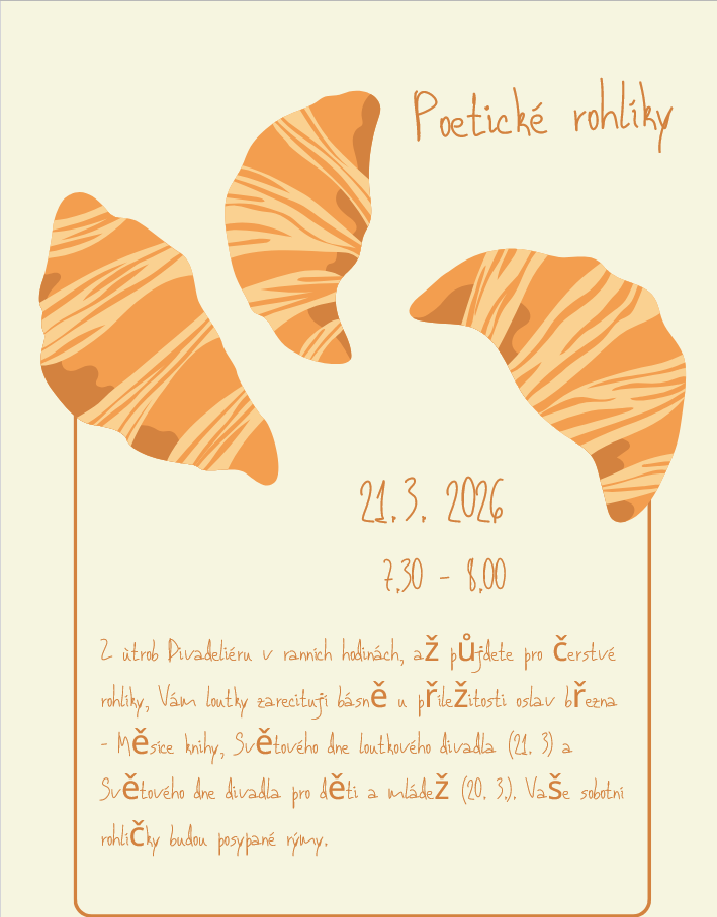 Až půjdete v sobotu ráno pro čerstvé pečivo, zastavte se u Divadeliéru. Přímo z jeho útrob vám loutky zarecitují básně u příležitosti Světového dne loutkového divadla. Vaše sobotní rohlíčky budou posypané rýmy! Průchod zdarma.