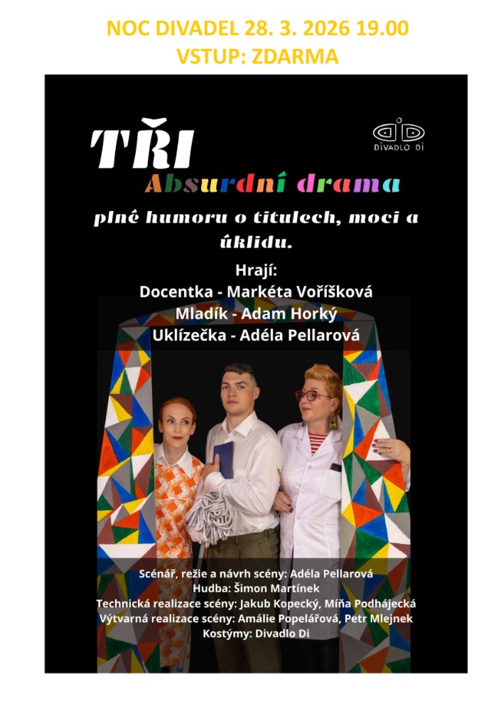 Absurdní drama divadla Di o hledání smyslu získávání titulů a způsobu jejich dosahování, získávání postavení a dosahování vlivu s úžasem poznání. Koncentrované myšlenky pro pozorného diváka, který provázen humorem se bude dobírat podstaty smyslu ověnčených jmen tituly. A ministerstvo v tom všem hraje důležitou úlohu. A hlavně! Je výborné umět (se) dobře uklidit… Hrají: M. Voříšková, A. Horký, A. Pellarová. Režie: A. Pellarová. Vstupné zdarma.