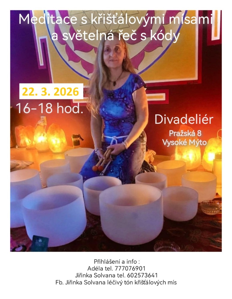 Jiřina Solvana vám hrou na křišťálové mísy zharmonizuje vaši mysl a laskavými slovy vás pohladí a vyladí. Na meditaci si s sebou vezměte prosím karimatku, deku nebo spacák, vodu a kamínek. Vstupné dobrovolné.