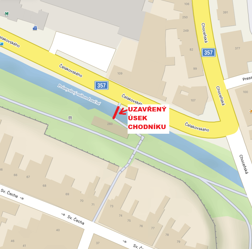 Uzavírka chodníku v místě lávky přes náhon Loučné v ulici Čelakovského