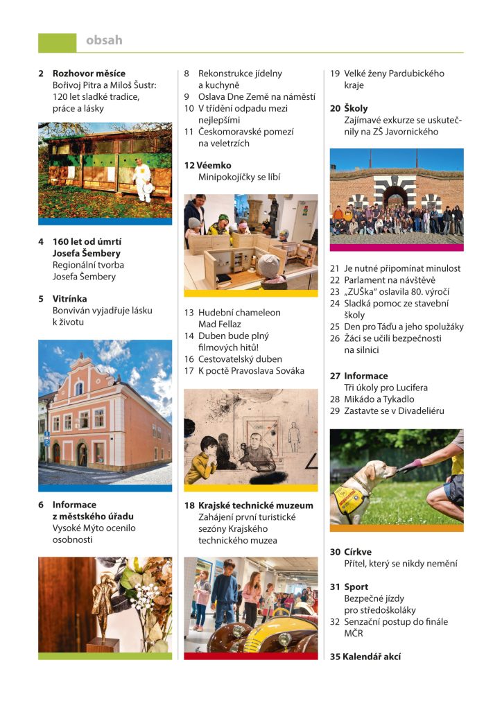 Dubnové číslo Vysokomýtského zpravodaje připomíná na své obálce „sladkou tradici“ – včelařský spolek ve Vysokém Mýtě letos slaví 120 let. O jeho historii i současnosti hovoří v rozhovoru měsíce Bořivoj Pitra a Miloš Šustr. Obálka zpravodaje dále láká do galerie na retrospektivní výstavu Pravoslava Sováka, uspořádanou ke 100. výročí autorova narození, na pálení čarodějnic na hasičském stadionu na Drábech a také na slavnostní zahájení první turistické sezóny nově otevřeného Krajského technického muzea. Rubrika připomínající 160 let od úmrtí Josefa Šembery představí čtenářům kreslířovu regionální tvorbu. Ve Vitrínce manželé Novotní prezentují kavárnu Bonviván, která sídlí v domě, za jehož citlivou rekonstrukci získali před sedmi lety sošku Kujeby. I v tomto čísle najdete aktuality z městského úřadu, včetně informace o ocenění místních osobností a oslavách Dne Země na náměstí. Nechybí ani zprávy ze škol a pozvánky na kulturní, sportovní a společenské akce a informace z místních institucí.