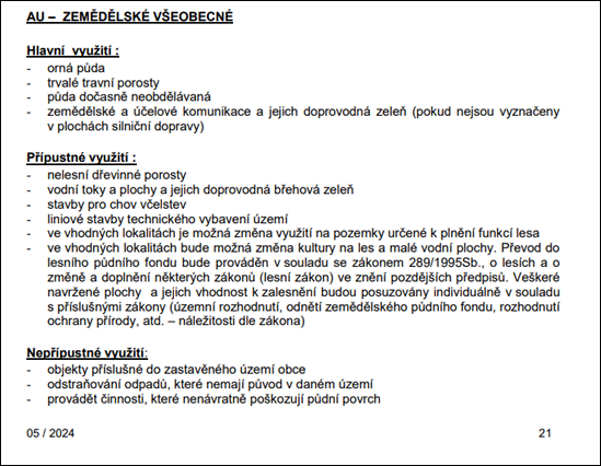 Absencí nové úpravy: Jelikož nebyla po nabytí účinnosti zákona 283/2021 Sb. pořízena nová územně plánovací dokumentace ani její změna v novém režimu, neexistuje k ploše AU definice území podle odpovídající terminologie § 41 NSZ.